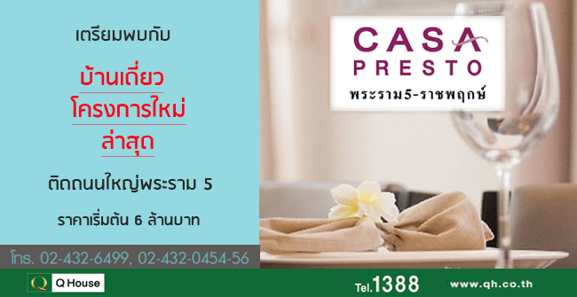 บริษัท ควอลิตี้ เฮ้าส์ จำกัด (มหาชน) เปิดจอง "คาซ่า เพรสโต พระราม 5-ราชพฤกษ์ (Casa Presto Rama 5-Ratchapruek)" บ้านเดี่ยวโครงการใหม่ล่าสุดจาก จาก คาซ่า แบรนด์ PRESTO ทำเลสะดวก ติดถนนใหญ่พระราม 5 และเปิดให้ผู้ที่สนใจลงทะเบียนผ่านทางเว็บไซต์เพื่อรับข้อมูลโครงการใหม่ก่อนใครได้ตั้งแต่วันนี้เป็นต้นไปท่านที่สนใจสามารถลงทะเบียนผ่านเว็บไซต์ได้ที่ลิงก์ด้านล่างนี้สอบถามรายละเอียดเพิ่มเติม โทร. 02-432-6499, 02-432-0454-56 หรือทางเว็บไซต์ http://www.qh.co.thข่าว-โปรโมชั่นล่าสุดอื่นๆ
