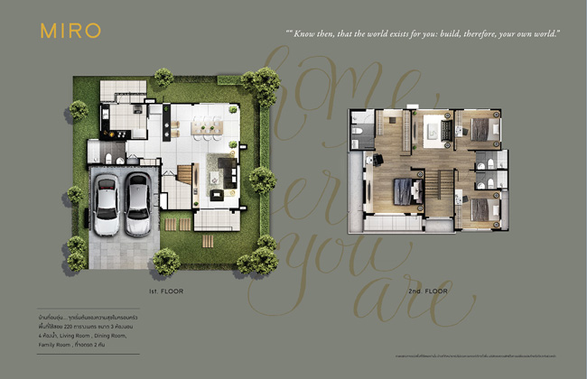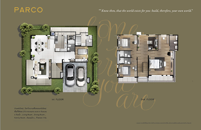 2. แบบบ้าน Parco พื้นที่ใช้สอย 275 ตร.ม. 4 ห้องนอน 4 ห้องน้ำ ห้องรับแขก ห้องรับประทานอาหาร ห้องนั่งเล่น ที่จอดรถ 2 คัน
