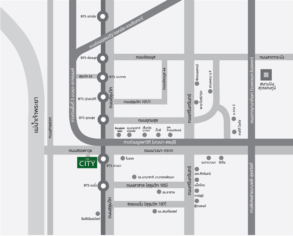 โครงการตั้งอยู่ในซอยออนป้า ถนนสรรพาวุธ แขวงบางนา เขตบางนา กรุงเทพฯ ทางเข้าหลัก (Main Entrance) ติดถนนสรรพาวุธซึ่งเชื่อมต่อกับถนนสายหลักอาทิ สุขุมวิท บางนา ใกล้ทางด่วนศรีรัช ด่านบางนา และทางด่วนบูรพาวิถี อีกทั้งใกล้รถไฟฟ้า สถานีอุดมสุขและบางนา เพียง 3 นาทีรายละเอียดโครงการโครงการ The City สุขุมวิท-แยกบางนา มีแบบบ้านให้เลือก 2 แบบ ดังนี้1. แบบบ้าน Miro พื้นที่ใช้สอย 220 ตร.ม 3 ห้องนอน 4 ห้องน้ำ ห้องรับแขก ห้องรับประทานอาหาร ห้องนั่งเล่น ที่จอดรถ 2 คัน