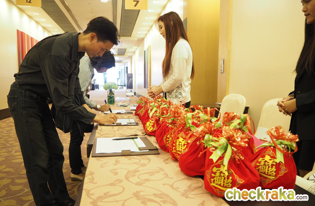 จุดลงทะเบียนเข้างาน ซึ่งวันนี้ตรงกับวันไหว้ตรุษจีนพอดี ทางพฤกษาจึงมอบส้มให้แก่สื่อมวลชนเพื่อความเป็นสิริมงคล