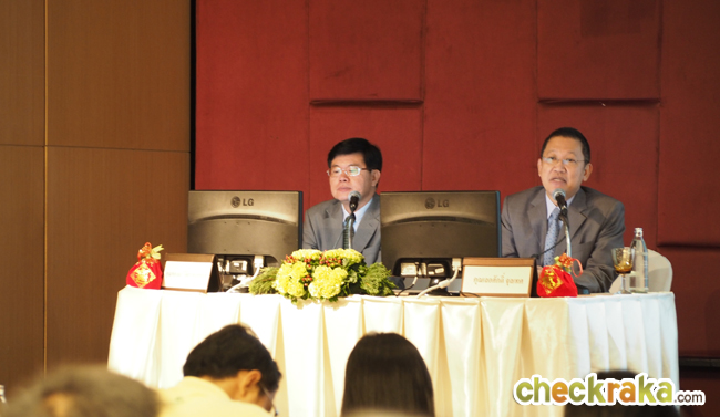 นายทองมา วิจิตรพงศ์พันธุ์ และนายเลอศักดิ์ จุลเทศ เริ่มการแถลงข่าวผลประกอบการประจำปี 2557