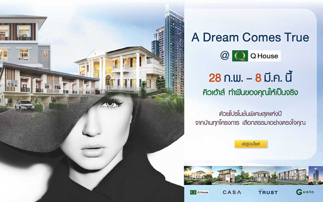 บริษัท ควอลิตี้เฮ้าส์ จำกัด (มหาชน) ผู้นำด้านอสังหาริมทรัพย์ ได้จัดโปรโมชั่นสุดพิเศษแห่งปี กับ "A Dream Comes True @ Q House" คิวเฮ้าส์ ทำฝันของคุณให้เป็นจริง ด้วยโปรโมชั่นพิเศษสุดแห่งปี จากบ้านทุกโครงการของควอลิตี้เฮ้าส์ และบริษัทในเครือ เลือกสรรมาอย่างตรงใจคุณ ตั้งแต่วันที่ 28 ก.พ. - 8 มี.ค. 2558 นี้เท่านั้น