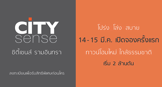 12 มี.ค. 58 3,226เปิดให้จองครั้งแรก ซิตี้เซนส์ รามอินทรา (City Sence Ramintra) 14-15 มี.ค. นี้ ราคาเริ่มที่ 2 ล้านต้น