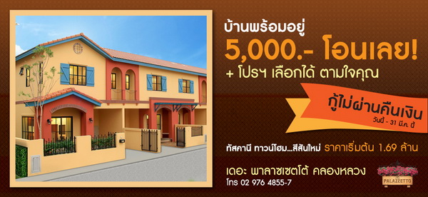 ทาวน์โฮม เดอะ พาลาซเซตโต้ คลองหลวง จัดโปรโมชั่นจอง 5,000 โอนได้เลย โครงการตั้งอยู่ ถนนเลียบคลอง 3 ตำบลคลองสาม อำเภอคลองหลวง จังหวัดปทุมธานี 12120 เป็นทาวน์โฮม 2 ชั้น โดยแต่ละหลังออกแบบให้มีกลิ่นอาย ทัสคานีสไตล์ แบบ Cluster Zone แบ่งกลุ่มบ้านเพียงโซนละ 6 ยูนิต หน้ากว้าง 6 เมตร บนเนื้อที่ตั้งแต่ 21.3 - 30 ตร.ว.แต่มีพื้นที่ใช้สอยดุจบ้านเดี่ยวถึงเกือบ 112 ตร.ม. ฟังก์ชันภายในออกแบบพิเศษให้โปร่งโล่งสบาย เปิดรับลมอย่างอิสระด้วยประตูหลัง 2 ตำแหน่ง 3 ห้องนอน 2 ห้องน้ำ 1 ที่จอดรถ พร้อมสวนหย่อมส่วนตัว ภายในติดตั้งระบบตรวจจับควันไฟ