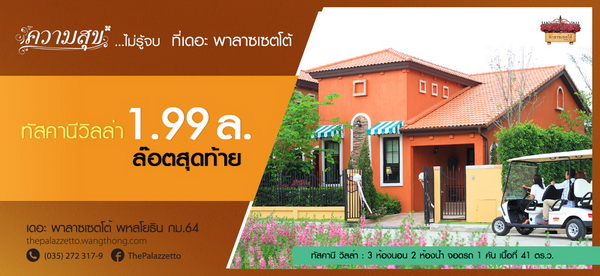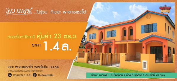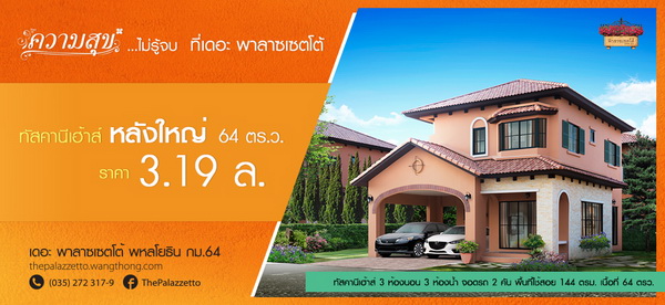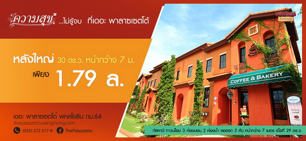 ทาวน์โฮม เดอะ พาลาซเซตโต้ พหลโยธิน กม.64 ตั้งอยู่ติดถนนพหลโยธิน กม.64 เพียง 20 นาที เป็นทาวน์โฮม 2 ชั้น หน้าบ้านกว้างถึง 7 เมตร ที่ไม่เหมือนใคร พื้นที่ใช้สอยมากถึง 136 ตารางเมตร บนขนาดที่ดินมาตรฐาน 29 ตารางวา จอดรถได้ 2 คัน การจัดพื้นที่ใช้สอยภายในบ้านที่ไม่คับแคบเหมือนทาวน์โฮมทั่วไป ตัวบ้านออกแบบด้วยสไตล์ Tuscany Country Design โดดเด่นสะดุดตาทุกมุมมอง จำกัดเพียง 106 ยูนิต เท่านั้น เพื่อความเป็นส่วนตัวที่มากกว่า เปิดขายในราคาพิเศษ