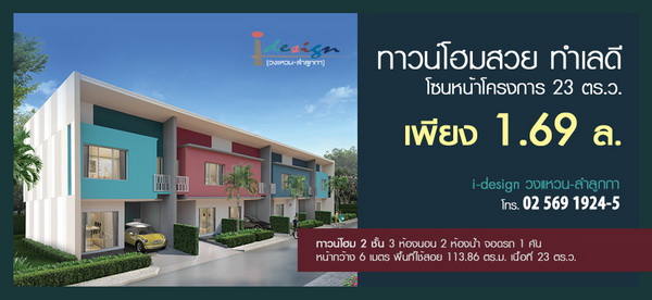 ทาวน์โฮมไอ-ดีไซน์ วงแหวน - ลำลูกกา ตั้งอยู่บนถนนลำลูกกา ตำบลบึงคำพร้อย อำเภอลำลูกกา จังหวัดปทุมธานี ทาวน์โฮม 2 ชั้น 3 ห้องนอน 2 ห้องน้ำ จอดรถ 1 คัน หน้ากว้าง 6 เมตร พื้นที่ใช้สอย 113.86 ตร.ม. เนื้อที่ 23 ตร.ว. อีกขั้นแห่งการสร้างสรรค์และความสมบูรณ์แบบที่ไม่จำเจด้วยสีสันที่สะดุดตา พร้อมกับการตกแต่งเส้นสายของงานเหล็กประดับ เรียบง่ายแต่ดูสง่างาม โดยสอดคล้องกันในทุกจังหวะของตัวบ้านทั้งด้านหน้าและด้านข้างอย่างลงตัว เปิดขายโซนใหม่หน้าโครงการ ทำเลดี