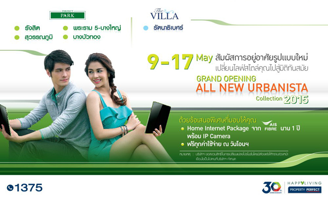 บริษัท พร็อพเพอร์ตี้ เพอร์เฟค จำกัด (มหาชน) จัดโปรโมชั่นพิเศษสำหรับลูกค้าที่สนใจบ้านไลฟ์สไตล์ใหม่ในยุคดิจิตอล "Grand Opening All New Urbanista Collection 2015" สัมผัสที่อยู่อาศัยรูปแบบใหม่ เปลี่ยนไลฟ์สไตล์คุณไปสู่มิติที่ทันสมัย ราคา 3.5 - 5 ล้านบาท ในวันที่ 9 - 17 พ.ค. 58 พร้อมรับข้อเสนอพิเศษ
