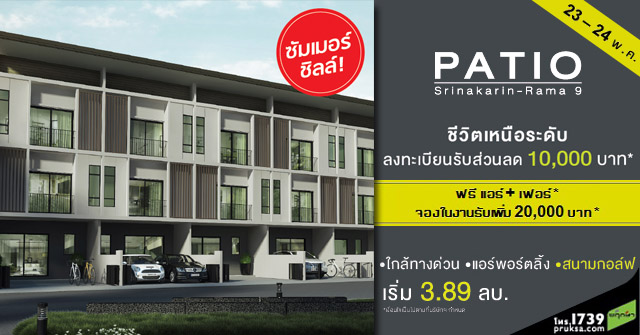พฤกษา เรียลเอสเตท เตรียมจัดงาน "ซัมเมอร์ชิลล์ (Summer Chill)" วันที่ 23-24 พฤษภาคมนี้ พบกับทาวน์โฮม พาทิโอ ศรีนครินทร์ - พระราม 9 (Patio Srinakarin - Rama 9) พร้อมจัดปาร์ตี้เปิดโครงการต้อนรับลูกค้า มอบโปรโมชั่นพิเศษคลายร้อนมาถึง 3 ต่อ ดังนี้
