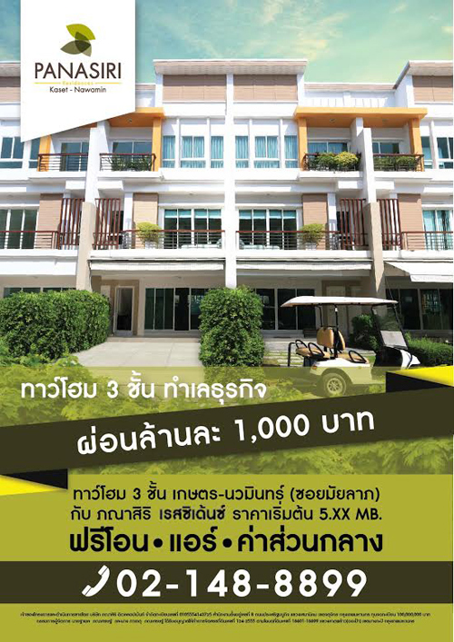 บริษัท ภณาสิริ ดิเวลลอปเม้นท์ จำกัด ได้จัดโปรโมชั่นโครงการ "ภณาสิริ เรสซิเด้นซ์ เกษตร-นวมินทร์ (Panasiri Residences Kaset-Nawamin)" พบกับแคมเปญ "ผ่อนเพียงล้านละ 1,000 บาท" และโปรโมชั่นพิเศษ เมื่อซื้อบ้าน ฟรีแอร์ ฟรีโอน ฟรีค่าส่วนกลาง ราคาพิเศษ เริ่ม 5.xx ล้าน โครงการทาวน์โฮมหรู 3 ชั้น ทำเลธุรกิจ บนแนวคิดการออกแบบบ้าน Style Modern Contemporary (เป็นโมเดิร์นร่วมสมัย) เป็นการนำแนวคิด การออกแบบสมัยเก่าและสมัยใหม่มาผสมผสานกันโดยเน้นโครงสร้างที่ดูมีความทันสมัย อย่างมีเอกลักษณ์