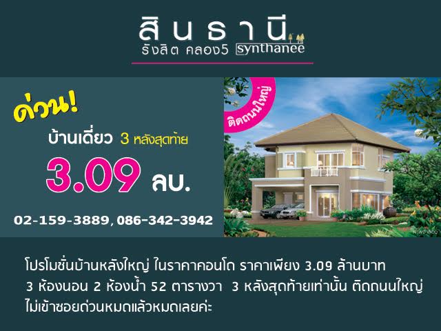 บริษัท สินธานี เอสเตท จำกัด ได้จัดโปรโมชั่นกับโครงการ "สินธานี แกรนด์วิลล์ รังสิต คลอง 5 (SynThanee Grandview)" ในแคมเปญ "โปรโมชั่นบ้านหลังใหญ่ ในราคาคอนโด ราคาเพียง 3.09 ล้านบาท 3 ห้องนอน 2 ห้องน้ำ 52 ตารางวา 3 หลังสุดท้ายเท่านั้น" ติดถนนใหญ่ ไม่เข้าซอย ด่วน! หมดแล้วหมดเลยค่ะสินธานี แกรนด์วิลล์ รังสิต คลอง 5 บ้านในสไตล์ Modern Contemporary ที่ให้ความรู้สึก โล่ง โปร่ง อยู่สบาย ตอบสนองครอบครัวไทย ที่ผูกพันกับธรรมชาติ หน้าต่างออกแบบใหม่แบบ Bay-Window เพิ่มแสงสว่างภายใน พร้อมบรรยากาศร่มรื่น ภายใต้สวนสวย ทุกแบบบ้าน มีเอกลักษณ์เฉพาะตัว ครบด้วยประโยชน์ใช้สอย ทั้งภายในและภายนอก