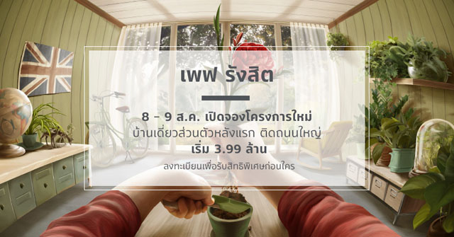บริษัท เอสซี แอสเสท คอร์ปอเรชั่น จำกัด (มหาชน) เตรียมเปิดจองบ้านเดี่ยวโครงการใหม่ ทำเลดีติดถนนใหญ่ ย่านรังสิต - คลอง 4 ในชื่อโครงการ "เพฟ รังสิต (Pave Rangsit)" มีทั้งหมด 320 ยูนิต ให้ความเป็นส่วนตัวบนเนื้อที่บ้านเริ่มต้น 50 ตารางวา โดยเปิดให้จองในวันที่ 8-9 สิงหาคม 2558ราคาเริ่มต้นที่ 3.99 ล้านบาทสำหรับท่านใดที่สนใจสามารถลงทะเบียนเพื่อรับสิทธิพิเศษก่อนใครได้ที่ลิงก์ด้านล่างนี้ค่ะสอบถามเพิ่มเติมได้ที่ โทร. 1749 หรือ www.scasset.comข่าว-โปรโมชั่นล่าสุดอื่นๆ