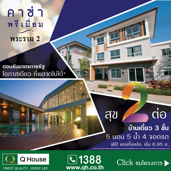 บริษัท ควอลิตี้ เฮ้าส์ จำกัด (มหาชน) มาพร้อมกับโปรโมชั่นสุดคุ้ม เนื่องจากวันที่ 29 ตุลาคม 2558 ที่ผ่านมาเมื่อรัฐบาลประกาศให้เริ่มใช้มาตรการกระตุ้นภาคอสังหาริมทรัพย์ โดยลดค่าโอน ค่าจดจำนอง เหลือเพียง 0.01% โครงการ คาซ่า พรีเมียม พระราม 2 จาก Q House จึงตอบรับมาตรการรัฐ พร้อมเพิ่มโปรโมชั่น "สุข 2 ต่อ" ส่งท้ายไตรมาส 4CASA PREMIUM โครงการบ้านเดี่ยว 3 ชั้น 3 แบบ ที่ให้พื้นที่ความสุขได้มากกว่า มากกว่า..กับทำเลศักยภาพที่เชื่อมต่อและเข้าออกได้หลายเส้นทาง มากกว่า...กับดีไซน์สุดโมเดิร์น โปร่ง โล่ง ให้คุณใช้ชีวิตได้อิสระเต็มที่ มากกว่า...กับฟังก์ชั่นที่ครบครัน คุ้มค่า มีให้เลือกสูงสุดถึง 5 ห้องนอนตอบทุกสไตล์ของชีวิตครอบครัว