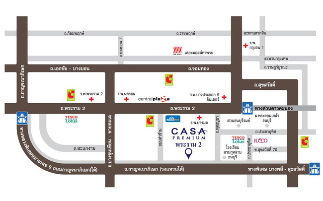 แผนที่โครงการคาซ่า พรีเมี่ยม พระราม 2โครงการตั้งอยู่ทำเลถนนวงแหวนกาญจนาภิเษก ไม่ไกลจาก เซ็นทรัลพระราม 2, บิ๊กซีพระราม 2, โลตัสพระราม 2, โรงพยาบาลนครธน, โรงพยาบาลบางกอก 9 อินเตอร์เนชั่นแนล, โรงเรียนสวนกุหลาบธนบุรี, โรงเรียนเลิศหล้ากาญจนาภิเษก, ทางด่วนดาวคะนอง, ทางด่วนวงแหวนกาญจนา และทางด่วนสุขสวัสดิ์ภาพบรรยากาศภายในโครงการคาซ่า พรีเมี่ยม พระราม 2