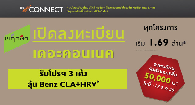 บริษัท พฤกษา เรียลเอสเตท จำกัด (มหาชน) จัดโปรโมชั่น เปิดลงทะเบียนทาวน์โฮม "The Connect" ทุกโครงการ โดยจองวันนี้ จะได้รับโปรฯ 3 เด้ง! + ส่วนลดเพิ่ม 2% พร้อมลุ้น Benz CLA + HRV* และเปิดให้ผู้ที่สนใจเข้าไปลงทะเบียนทางเว็บไซต์ เพื่อรับส่วนลดพิเศษเพิ่มเติมอีก 50,000 บาท วันนี้ - 17 ธันวาคม 2558ราคาเริ่มต้น 1.69 ล้านบาท*
