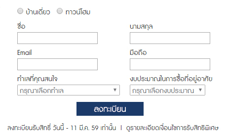 พร้อมรับสิทธิ์ ส่งท้ายมาตรการรัฐ ค่าธรรมเนียม จดทะเบียนการโอนและค่าจดจำนองอสังหาริมทรัพย์เหลือ 0.01% โดยโครงการ ที่ร่วมแคมเปญมีทั้งบ้านเดี่ยว ราคาเริ่ม 3.59 - 40 ล้านบาท และทาวน์โฮม ราคาเริ่ม 2-7.5 ล้านบาทท่านที่สนใจสามารถลงทะเบียนรับสิทธิพิเศษ รับ Gift Voucher มูลค่า 10,000 บาท ได้ที่ลิงก์ด้านล่างนี้ (สำหรับผู้ที่ลงทะเบียน และจองบ้านภายใน 13 มี.ค. 59)สำหรับโครงการที่เข้าร่วมมีทั้งบ้านเดี่ยว และ ทาวน์โฮม จำนวน 28 โครงการ ราคา เริ่ม 2 - 40 ล้าน มีดังนี้ทำเลรังสิต- บ้านพฤกษ์ลดา 3 รังสิต-คลอง 4 ราคาเริ่มต้น 3.69 - 7 ล้านบาท