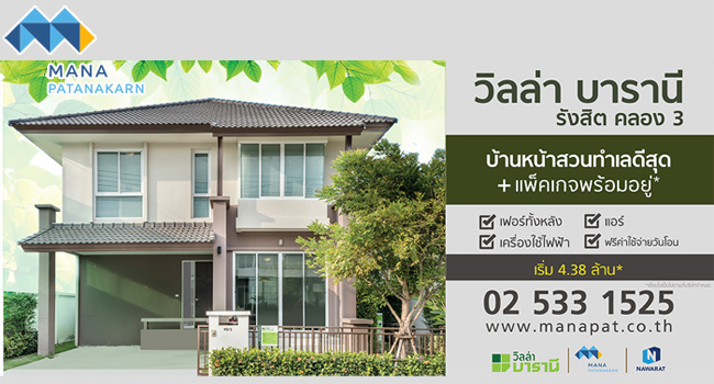 25 มี.ค. 59 2,092มานะพัฒนาการ เปิดจองบ้านพร้อมอยู่ "วิลล่า บารานี รังสิต คลอง 3" พร้อมโปรฯ พิเศษ เริ่ม 4.38 ล้านบาท