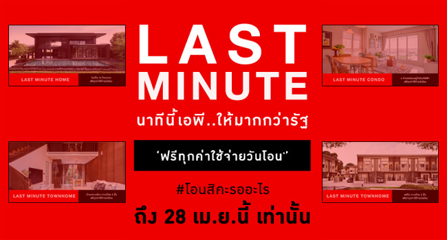 บริษัท เอพี (ไทยแลนด์) จำกัด (มหาชน) ส่งแคมเปญใหม่ "LAST MINUTE" ให้มากกว่ามาตรการรัฐ ยกขบวน บ้านเดี่ยว ทาวน์โฮม และคอนโด กว่า 50 โครงการพร้อมอยู่ โปรฯ แรง ราคาสุดคุ้ม เช็คกันค่ายต่อค่าย แรงจริง คุ้มจริง อาทิ ฟรีทุกค่าใช้จ่ายวันโอน* และโบนัสส่วนลดพิเศษต่างๆ อีกมากมาย ทาวน์เฮ้าส์ ราคาเริ่มต้นที่ 1.89 ล้านบาท บ้านเดี่ยว ราคาเริ่มต้นที่ 3.69 ล้านบาท และคอนโด ราคาเริ่มต้นที่ 1.8 ล้านบาท อย่าเพิ่งรีบตัดสินใจซื้อที่ไหน มาลองเช็คราคากับ AP กันก่อน ตั้งแต่วันนี้ - 30 เมษายน 2559บ้านเดี่ยว