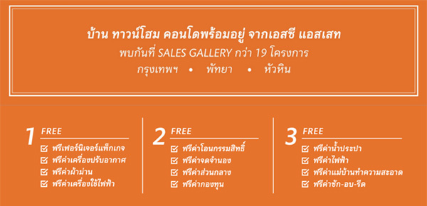 บริษัท เอสซี แอสเสท คอร์ปอเรชั่น จำกัด (มหาชน) นำโครงการคุณภาพพร้อมอยู่ทั้ง บ้านเดี่ยว, ทาวน์โฮม, โฮมออฟฟิศ, และคอนโดมิเนียม จัดแคมเปญ "เต็ม! เต็ม! อยู่ได้เลย จัดให้ฟรี! สูงสุด 2 ล้าน*" โดยมี คุณมงกุฎ เตโชฬาร ผู้อำนวยการฝ่ายอาวุโส ฝ่ายพัฒนาทรัพย์สินแนวราบ กลุ่ม C เป็นตัวแทนผู้บริหาร จับมือกับ คุณพิมลพร พูลนาผล Senior Vice President ผลิตภัณฑ์และช่องทางบริการ พร้อมด้วยคุณสมชาย พันธรักษ์ Vice President สายลูกค้าบุคคล ธนาคารกรุงเทพ มอบสิทธิพิเศษ จัดผ่อนล้านละ 1,000 บาท เพื่อสนับสนุนก่อนมาตรการรัฐจะสิ้นสุด ตั้งแต่วันนี้ - 28 เมษายน 2559 ที่ Sales Gallery ทั้ง 19 โครงการทั่วกรุงเทพฯ พัทยาและหัวหิน ราคาเริ่ม 2 - 20 ล้านบาท พร้อมด้วยโปรฯ แรงแห่งปีสุดคุ้ม