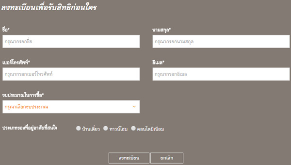 ผู้ที่สนใจสามารถลงทะเบียนรับสิทธิพิเศษได้ที่ลิงก์ด้านล่างนี้ค่ะ* โปรโมชั่น "อยู่ได้เลย จัดให้ฟรี! สูงสุด 2 ล้าน" เฉพาะโครงการ และแปลงที่กำหนดเท่านั้น โดยมีเงื่อนไขดังนี้