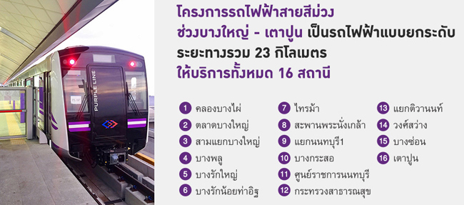 โดยตลอดทั้งเส้นทางของรถไฟฟ้าสายสีม่วงมีจุดเชื่อมต่อกับระบบขนส่งมวลชนต่างๆ เช่น เชื่อมกับรถไฟฟ้าสายสีแดง ช่วงบางซื่อ - ตลิ่งชั้น ของการรถไฟแห่งประเทศไทย (รฟท.) สถานีเตาปูน เชื่อมกับสถานีบางซื่อของรถไฟฟ้ามหานครสายเฉลิมรัชมงคล (MRT) (ในอนาคต) สถานีศูนย์ราชการนนทบุรี เชื่อมกับรถไฟฟ้าสายสีชมพูช่วงแคราย - นนทบุรี (ในอนาคต) สถานีสะพานพระนั่งเกล้า เชื่อมกับเรือด่วนเจ้าพระยาบริเวณท่าเรือพระนั่งเกล้า โดย รฟม. เป็นผู้รับผิดชอบการก่อสร้าง และสถานีคลองบางไผ่ เชื่อมกับระบบขนส่งมวลชนอื่นๆ เช่น รถโดยสารประจำทางองค์การขนส่งมวลชนกรุงเทพ (ขสมก.) รถรับจ้างส่วนบุคคลสาธารณะ ส่วนผู้ที่ใช้รถยนต์ส่วนตัวสามารถเปลี่ยนมาเดินทางด้วยรถไฟฟ้าสายสีม่วงได้อย่างสะดวกด้วยการใช้บริการ อาคารจอดรถแล้วจร ที่เชื่อมต่อกับสถานีรถไฟฟ้าทั้ง 4 แห่ง คือ สถานีคลองบางไผ่, สถานีสามแยกบางใหญ่, สถานีบางรักน้อยท่าอิฐ และสถานีแยกนนทบุรี 1 โดยระหว่างเดือน มิ.ย. - ก.ค. อยู่ในช่วงการทดสอบระบบ เดินรถเสมือนจริง ให้ประชาชนสามารถลงทะเบียนเพื่อร่วมทดลองใช้บริการรถไฟฟ้าได้ฟรีนอกจากระบบคมนาคมที่ทันสมัยแล้ว พื้นที่ฝั่งตะวันตกยังเต็มไปด้วย ห้างสรรพสินค้าขนาดใหญ่อีกหลายแห่ง อาทิ เซ็นทรัล พลาซ่า เวสต์เกท, เซ็นทรัล พลาซ่า แจ้งวัฒนะ, เซ็นทรัล พลาซ่า รัตนาธิเบศร์, เดอะ คริสตัล พีทีที ฯลฯสอบถามรายละเอียดเพิ่มเติมโทร 1375 เว็บไซต์ : www.pf.co.th/2016/th/homeข่าว-โปรโมชั่นล่าสุดอื่นๆ