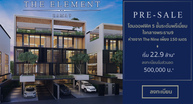 เตรียมพบกับการเปิดตัว โฮมออฟฟิศ ระดับพรีเมียม "The Element Rama 9" โฮมออฟฟิศ 5 ชั้น ใจกลางพระราม 9 ย่าน CBD ห่างจาก The Nine เพียง 150 เมตร ราคาเริ่มต้นที่ 22.9 ล้าน พร้อมเปิดให้ลงทะเบียนรับส่วนลดเพิ่มเติม 500,000 บาท* พบกันวัน Pre-sale เร็วๆ นี้