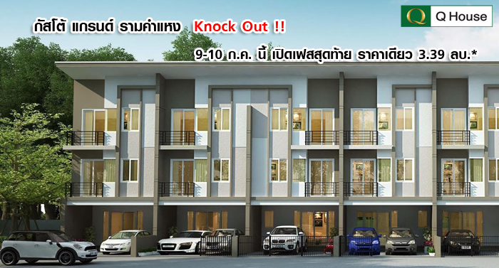 Q House ได้จัดโปรโมชั่นต้อนสุดคุ้มกับโครงการ "กัสโต้ แกรนด์ รามคำแหง (Gusto Grand Ramkhamhaeng)" ทาวน์โฮมหรู 3 ชั้น 4 ห้องนอน 5 ห้องน้ำ ทำเลใกล้รถไฟฟ้า ในวันที่ 9-10 ก.ค. นี้ กับโปรฯ Knock out !! เปิดเฟสสุดท้าย ราคาเดียว 3.39 ลบ.* พิเศษ!! จองรับเพิ่ม HomePro ที่โครงการ กัสโต้ แกรนด์ รามคำแหง