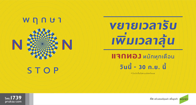 บริษัท พฤกษา เรียลเอสเตท จำกัด (มหาชน) จัดแคมเปญพิเศษ "Pruksa Non-Stop" พฤกษาขยายเวลา ให้ไม่หยุด? แจกทองหนัก!! ทุกเดือนกับโปรโมชั่น "พฤกษา NON-STOP" ขยายเวลารับ เพิ่มเวลาลุ้น มอบสิทธิพิเศษมากมาย ตั้งแต่วันที่ 1 กรกฎาคม - 30 กันยายน นี้ ทำสัญญาจองบ้าน ทาวน์เฮ้าส์ หรือคอนโด กับพฤกษา ได้รับข้อเสนอพิเศษสุดจากกว่า 140 โครงการทั่วประเทศ พบกับ Non-Stop ดังต่อไปนี้