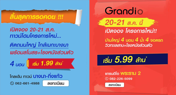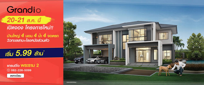 เปิดให้จองทาวน์โฮมโครงการใหม่ 20-21 ส.ค. นี้ ทำเลบางนา - กิ่งแก้ว พบกับทาวน์โฮม 4 ห้องนอน 3 ห้องน้ำ ติดถนนใหญ่ ใกล้ทางด่วน และเมกะบางนา พร้อมสโมสร + โรงหนังส่วนตัว เริ่ม 1.99 ล้านบาท*สอบถามรายละเอียดเพิ่มเติม โทร. 062-661-4988ผู้ที่สนใจสามารถลงทะเบียนเพื่อรับสิทธิพิเศษส่วนลด 10,000 บาทได้ที่ลิงก์ข้างล่างนี้2. แกรนดิโอ พระราม 2 (Grandio Rama 2)