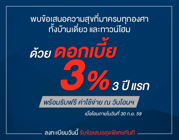9 ส.ค. 59 2,912PF จัดโปรฯ บ้านเดี่ยว และทาวน์โฮม "ความสุข 360 องศา" ดอกเบี้ย 3% 3 ปีแรก ฟรีค่าใช้จ่ายวันโอน