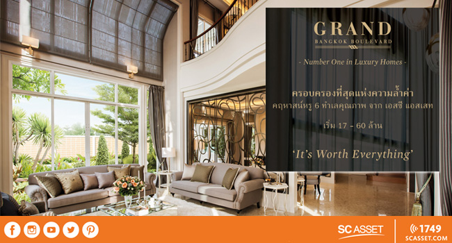 บริษัท เอสซี แอสเสท คอร์ปอเรชั่น จำกัด (มหาชน) นำ 6 โครงการหรู ทำเลคุณภาพ จัดงาน "It's worth everything" โดยหนึ่งในโครงการล่าสุด คือ โครงการ แกรนด์ บางกอก บูเลอวาร์ด ราชพฤกษ์-พระราม 5 ขนาดพื้นที่ 25-2-3.7 ไร่ มูลค่าโครงการ 1,500 ล้านบาท โครงการพัฒนาภายใต้คอนเซปต์ 1 โครงการ 1 แรงบันดาลใจ เป็นคฤหาสน์ 3 ชั้น สไตล์ Modern Luxury จำนวนเพียง 41 หลัง ท่ามกลางสังคมที่เป็นส่วนตัว ราคาเริ่มต้น 30 ล้านบาท มีฟังก์ชั่นที่ครบครัน ขนาด 5 ห้องนอน 6 ห้องน้ำ พร้อมที่จอดรถ 4 - 5 คัน และพื้นที่ใช้สอยภายในที่เพิ่มขึ้น ประกอบไปด้วยจุดเด่นที่แตกต่าง ได้แก่ Grand Double Volume Living Room, Grand Courtyard บริเวณชั้นสอง และนวัตกรรมสำหรับผู้สูงอายุ มีบ้านตัวอย่าง 2 แบบ ได้แก่- แบบ VERANDA มีพื้นที่ใช้สอย 725 ตารางเมตร