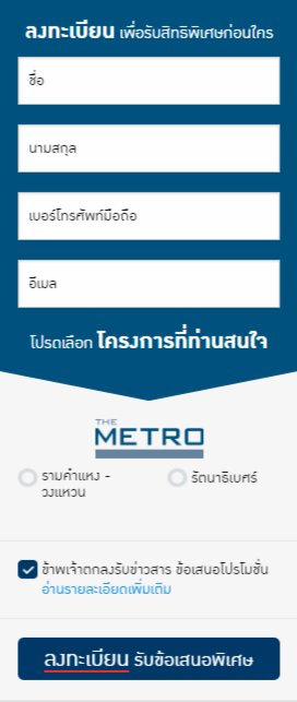 เดอะเมทโทร รัตนาธิเบศร์ (The Metro) ทาวน์โฮม 3 ชั้น โครงการติดแนวรถไฟฟ้าสายสีม่วง (บางใหญ่-บางซื่อ) สถานีไทรม้า สะดวกทุกการเชื่อมต่อ เพียง 800 เมตร จากถนนรัตนาธิเบศร์ เชื่อมต่อไปยัง ถ.พระราม 5 - ราชพฤกษ์ ให้คุณสู่จุดต่างๆ ได้อย่างรวดเร็ว ครบครัน คุ้มค่า ไม่ต้องต่อเติม เนื่องจากมีพื้นที่ใช้สอยระดับบ้านเดี่ยว ปรับเปลี่ยนได้ พร้อมทั้งแตกต่างด้วยมาสเตอร์คลับขนาดใหญ่ พิเศษด้วย Facilities ที่ได้มาตรฐาน อาทิ ฟิตเนส ซาวน่า สตีม และสระว่ายน้ำ เริ่ม 3.99 ล้านบาทผู้ที่สนใจ สามารถลงทะเบียนเพื่อรับสิทธิพิเศษได้ที่ลิงก์ข้างล่างนี้เงื่อนไขเป็นไปตามที่บริษัทฯกำหนด ขอสงวนสิทธิ์ในการเปลี่ยนแปลงโดยที่มิต้องแจ้งให้ทราบล่วงหน้าสอบถามข้อมูลพิ่มเติม โทร. 1375 และเว็บไซต์ http://pf.co.th/home/แท็กที่เกี่ยวข้อง :
