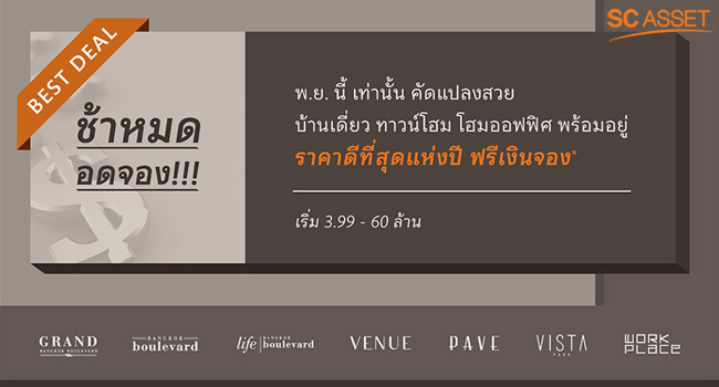 Best Deal จาก SC Asset พ.ย.นี้ พบกับบ้านเดี่ยว ทาวน์โฮม โฮมออฟฟิศ พร้อมอยู่ ราคาดีที่สุดแห่งปี ฟรีเงินจอง เริ่ม 3.99 - 60 ล้านบาท