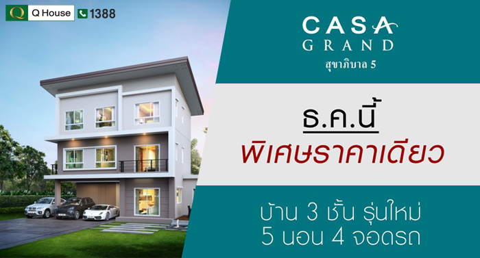 บริษัท ควอลิตี้ เฮ้าส์ จำกัด (มหาชน) หรือ Q House เชิญลูกค้าที่สนใจบ้านเดี่ยว 3 ชั้น ด้วยโปรโมชั่นต้อนรับปลายปี กับโครงการ คาซ่า แกรนด์ สุขาภิบาล 5 (Casa Grand Sukapiban 5) เปิดบ้าน 3 ชั้นรุ่นใหม่ คุ้มด้วยฟังก์ชั่นที่ให้มากถึง 5 ห้องนอน 5 ห้องน้ำ 4 ที่จอดรถ ธ.ค.นี้ พิเศษราคาเดียว ท่านที่สนใจสามารถไปชมบ้านได้ที่โครงการ ซึ่งความพิเศษนี้มีให้ภายในเดือนธันวาคม 2559 นี้เท่านั้นค่ะ