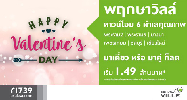 บริษัท พฤกษา เรียลเอสเตท จำกัด (มหาชน) จัดโปรโมชั่นต้อนรับวันวาเลนไทน์ Happy Valentine's Day กับแบรนด์ พฤกษาวิลล์ ทาวน์โฮม 6 ทำเลคุณภาพ ได้แก่ พระราม 2, พระราม 5, บางนา, เพชรเกษม, ชลบุรี, และเชียงใหม่ จะมาเดี่ยวหรือมาคู่ก็ลด ราคาเริ่มต้นที่ 1.49 ล้านบาท*สำหรับโครงการที่เข้าร่วมโปรโมชั่น มีดังต่อไปนี้