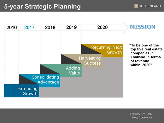 ธนพล กล่าวต่อว่า โกลเด้นแลนด์ ได้วางแผนธุรกิจ 5 ก้าว โดยเริ่มตั้งแต่ปี 2559-2563 ไว้ดังนี้