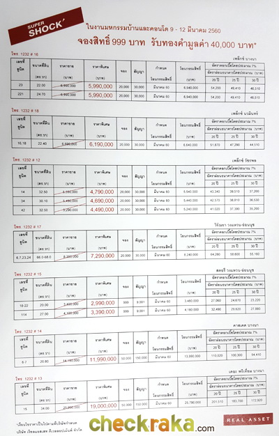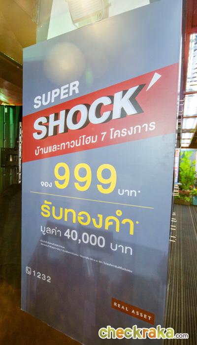REAL ASSET ก็ไม่พลาดที่จะเข้าร่วมงานนี้เช่นกัน ภายใต้แคมเปญ "SUPER SHOCK จอง 999 บาท ทองคำมูลค่า 40,000 บาท" ได้นำบ้าน ทาวน์โฮม และอาคารพาณิชย์ 7 โครงการ มาจัดโปรโมชั่น SUPER SHOCK บาท จอง 999 บาท ภายในงาน หากไปชมโครงการแล้วไม่ถูกใจยินดีคืนเงิน หากชมแล้วชอบ พร้อมโอนภายใน 30 เม.ย. 60 รับทองคำมูลค่า 40,000 บาท ไปได้เลย โครงการทั้ง 7 ที่ร่วมโปรโมชั่น ได้แก่