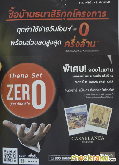 ปีนี้ ธนาสิรินำบ้านคุณภาพพร้อมอยู่ 6 โครงการมาจัดโปรโมชั่นพิเศษสุด "Thana set zero" ฟรีทุกค่าใช้จ่าย ณ วันโอน พร้อมรับส่วนลดสูงสุดครึ่งล้าน รับสิทธิพิเศษ!!!เมื่อจองในงาน ลุ้นรับแพ็คเกจท่องเที่ยว เมืองคาซาบลังกา ประเทศโมร็อคโค ฟรี 2 ที่นั่ง (ราคาแพ็คเกจท่องเที่ยวมูลค่า 200,000 บาท) เมื่อจองและโอนภายในเดือน พฤษภาคม 2560