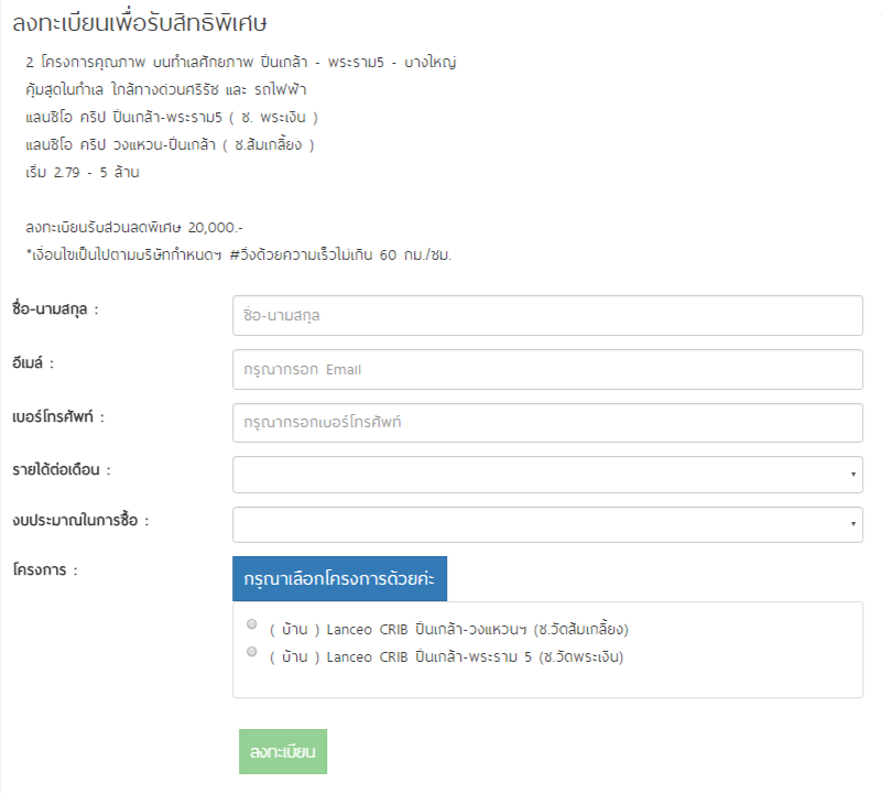 บริษัท ลลิล พร็อพเพอร์ตี้ จำกัด (มหาชน) ส่ง 2 โครงการคุณภาพ บนทำเลศักยภาพ ปิ่นเกล้า - พระราม5 - บางใหญ่ กับโครงการ "แลนซีโอ คริป ปิ่นเกล้า-พระราม 5 (ซ.วัดพระเงิน) (Lanceo CRIB Pinklao - Rama 5)" พบกับบ้านเดี่ยว Kingsize ตกแต่งสวนมาให้ พร้อมเปิดโซนคลับเฮ้าส์ให้คุณได้จับจองแล้ววันนี้ และอีกโครงการ "แลนซีโอ คริป ปิ่นเกล้า - วงแหวน (ส้มเกลี้ยง) (Lanceo CRIB Pinklao - Wongwaen)" พบกับบ้านพร้อมสวน เพียง 5 นาที จากทางด่วนศรีรัช คุ้มสุดในทำเลแถบนี้ ใกล้ทางด่วนศรีรัช และ รถไฟฟ้าสายสีม่วง บางซื่อ - บางใหญ่ ท่านที่สนใจสามารถลงทะเบียนรับส่วนลดพิเศษ 20,000 บาทได้ที่เว็บไซต์ของลลิล พร็อพเพอร์ตี้ท่านที่สนใจสามารถลงทะเบียนเพื่อรับสิทธิพิเศษได้แล้วที่ลิงก์ด้านล่างนี้แลนซีโอ คริป ปิ่นเกล้า-พระราม 5 (ซ.วัดพระเงิน) (Lanceo CRIB Pinklao - Rama 5)