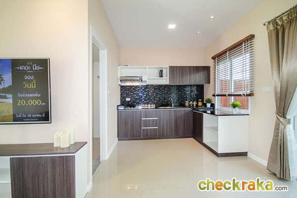 ประตูบานเลื่อนกระจกด้านหลังบานใหญ่ ทำให้พื้นที่ด้านหลังบ้านดูโปร่งและสว่างมากขึ้น ระดับจากพื้นสูงถึงเพดานถึง 2.8 เมตร ทำให้รู้สึกถึงความโล่งปร่งสบาย ซึ่งบริเวณพื้นที่ด้านหลังบ้านและโรงรถ เราได้ตอกเสาเข็มขนาดเท่ากับตัวบ้าน จึงหมดปัญหาเรื่องการทรุดตัว รองรับให้กับทุกความต้องการในระยะยาว อาทิเช่น ห้องซักรีด, ครัวไทย, หรือพื้นที่ส่วนพักผ่อน ซึ่งถือเป็นสิ่งที่พิเศษสุดที่โครงการมอบให้กับลูกค้า