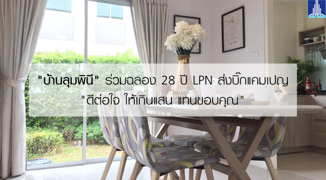 "บ้านลุมพินี" ในเครือ L.P.N. DEVELOPMENT GROUP ร่วมฉลองครบรอบ 28 ปี LPN ด้วยบิ๊กแคมเปญ "ดีต่อใจ ให้เกินแสน แทนขอบคุณ" มอบของขวัญเป็นส่วนลดสุดพิเศษมากมาย อาทิ แอร์ 3 ห้องนอน, ปั๊มน้ำ, แท็งก์น้ำ, ค่าธรรมเนียมโอน, ค่าส่วนกลาง 1 ปี, ค่าประกันมิเตอร์ไฟ, ค่าประกันมิเตอร์น้ำ พร้อมรับดับเบิ้ลโบนัสเงินคืนสูงสุดถึง 10% (Cash Back 10%)
