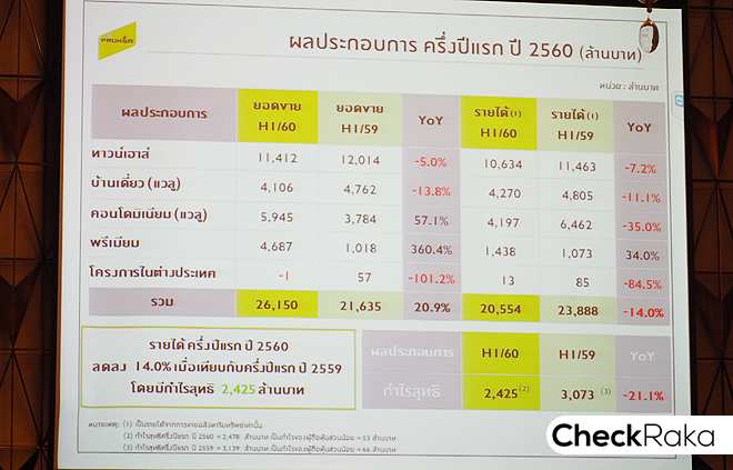 นายปิยะ ประยงค์ ประธานเจ้าหน้าที่บริหาร กลุ่มธุรกิจพฤกษา เรียลเอสเตท บริษัท พฤกษา เรียลเอสเตท จำกัด (มหาชน) เปิดเผยถึงผลประกอบการครึ่งปีแรก ประจำปี 2560 ว่า "บริษัทฯ สามารถทำยอดขายได้ 26,150 ล้านบาท เติบโตเพิ่มขึ้น 20.9% เมื่อเทียบกับช่วงเดียวกันของปี 2559 ที่มียอดขาย 21,635 ล้านบาท โดยยอดขายที่เติบโตขึ้นมาจากการเปิดขายคอนโดมิเนียมใหม่ 3 โครงการ ซึ่งได้รับการตอบรับที่ดีเยี่ยมจากลูกค้า คือ เดอะทรี สุขุมวิท 71-เอกมัย เดอะรีเซิร์ฟ ทองหล่อ และแชปเตอร์วัน ชายน์ บางโพ นอกจากนี้บริษัทฯ ยังสามารถทำรายได้รวม 20,554 ล้านบาท และกำไรสุทธิ 2,425 ล้านบาท ส่วนภาพรวมตลาดอสังหาริมทรัพย์ในกรุงเทพฯและปริมณฑล ครึ่งปีแรกยอดขายยังเติบโตอยู่ที่ 15.9% ถือว่าเติบโตกว่าที่คาดการณ์ไว้ และคาดว่าปี 2560 จะโตอยู่ที่ 7% สะท้อนให้เห็นว่าภาคอสังหาริมทรัพย์เริ่มมีการฟื้นตัวเนื่องจากผู้ประกอบการมีการปรับกลยุทธ์ให้สอดคล้องกับสภาวะเศรษฐกิจในปัจจุบัน รวมถึงพฤกษา ที่มีการรุกตลาดพรีเมียมเพื่อขยายฐานลูกค้าระดับบนที่มีกำลังซื้อสูง และมีการขยายธุรกิจอื่นๆ ที่สามารถสร้างรายได้อย่างต่อเนื่อง"