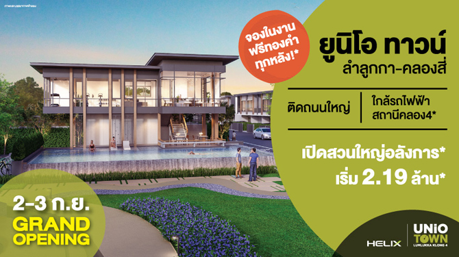Grand opening ยูนิโอ ทาวน์ ลำลูกกา คลอง 4 (Unio Town Lamlukka Klong 4) 2-3 ก.ย.นี้ จองในงาน ฟรีทองคำ ทุกหลัง เพียง 2 วันเท่านั้น* ทาวน์โฮม 2 และ 3 ชั้น หน้ากว้าง 5.7 เมตร กับจุดเด่นเรื่องประโยชน์ใช้สอยภายในบ้าน มีห้องอเนกประสงค์ที่สามารถปรับเปลี่ยนเป็นห้องนอนชั้นล่างได้ พร้อมทั้งพื้นที่ส่วนกลางที่มีพื้นที่สีเขียวขนาดใหญ่ ให้คุณได้ใกล้ชิดกับธรรมชาติเต็มที่ ราคาเริ่ม 2.19 ล้าน*
