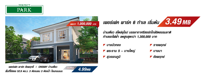 เพอร์เฟค พาร์ค 6 ทำเล บ้านเดี่ยว สไตล์ยุโรป บรรยากาศรีสอร์ทใกล้ชิดธรรมชาติ ทำเลรถไฟฟ้า ลดสูงสุดกว่า 1,300,000 บาท เริ่มต้น 3.49 ล้านบาท- เพอร์เฟค พาร์ค บางบัวทอง (Perfect Park)