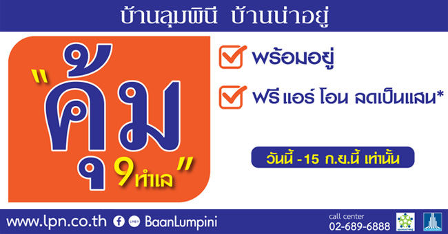 "บ้านลุมพินี" ในเครือ L.P.N. DEVELOPMENT GROUP ขอบคุณลูกค้าด้วยแคมเปญ "คุ้ม 9 ทำเล" คัดสรรบ้านพร้อมอยู่ทำเลทอง ได้แก่ ราชพฤกษ์-นครอินทร์, แจ้งวัฒนะ-ติวานนท์, เพิ่มสิน-วัชรพล, สุขสวัสดิ์-พระราม ๒, รังสิต คลอง ๒, ราชพฤกษ์-ปิ่นเกล้า, ลาดปลาดุก-บางไผ่ สเตชั่น, บางนา-ศรีนครินทร์ และสวนหลวง ร.๙ ด้วยการนำบ้านสวย ตำแหน่งดีของแต่ละโครงการมาให้ลูกค้าเลือกสรร ภายใต้คุณค่าที่ตั้งใจส่งมอบตามแนวคิด "บ้านลุมพินี บ้านน่าอยู่" ในแนวทาง "บ้านดี สิ่งแวดล้อมดี ดูแลดี ผู้คนดี" ด้วยราคาสุดคุ้ม เริ่ม 1.75 ล้านบาทพิเศษ! เพียงจองและโอนกรรมสิทธิ์ ภายในวันนี้ - 15 กันยายน 2560 นี้ รับฟรีทันที เครื่องปรับอากาศ 3 ห้องนอน, ปั๊มน้ำ, แท็งก์น้ำ, ค่าธรรมเนียมการโอนกรรมสิทธ์, ค่าส่วนกลาง 1 ปี, ค่าประกันมิเตอร์ไฟ, ค่าประกันมิเตอร์น้ำ (เฉพาะโครงการและแปลงที่กำหนด) มูลค่ารวมกว่าแสน