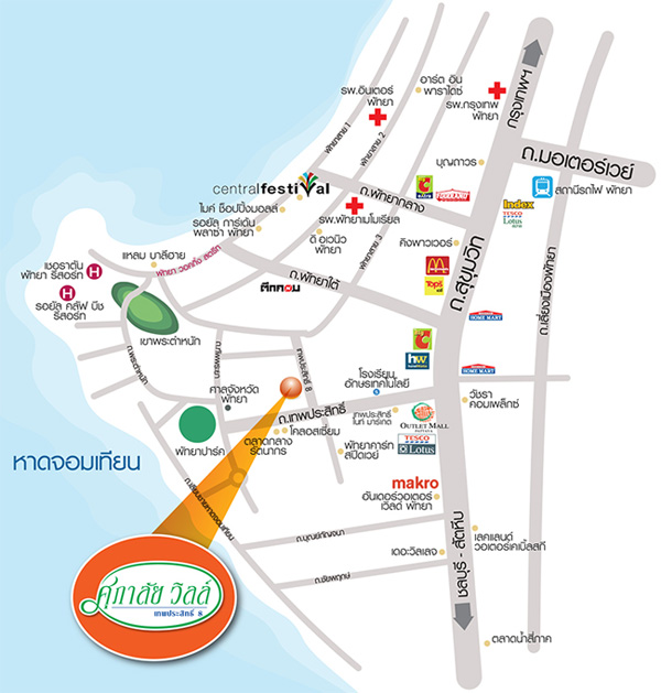 สถานที่ใกล้เคียง เช่น Outlet Mall, พัทยา ปาร์ค, โคลอสเซี่ยม และหาดจอมเทียน จุดเด่นของโครงการศุภาลัย วิลล์ เทพประสิทธิ์ 8