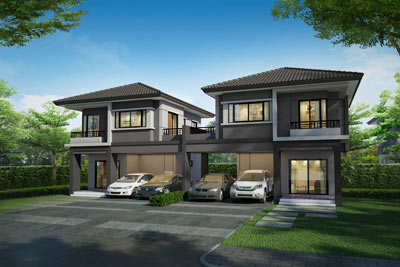 ภาพจำลองแบบบ้าน DH-120 2. DH-130 - บ้านแฝด 2 ชั้น 3 ห้องนอน 2 ห้องน้ำ 2 ที่จอดรถ พร้อมห้องครัวแยกเป็นสัดส่วน แตกต่างจากบ้านแฝดแบบแรกคือ มีที่จอดรถเพิ่มมาอีก 1 คัน
