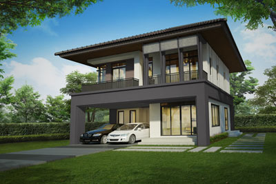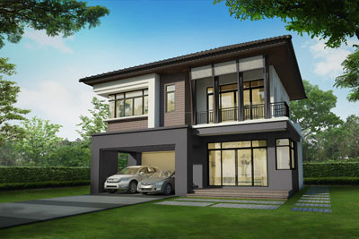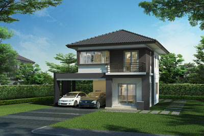 ภาพจำลองแบบบ้าน SH-140 4. SH-180 - บ้านเดี่ยว 2 ชั้น 3 ห้องนอน 3 ห้องน้ำ 2 ที่จอดรถ พร้อมห้องรับแขก และห้องครัวแยกเป็นสัดส่วน