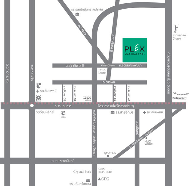 แผนที่โครงการ เพล็กซ์ วัชรพล (Plex Watcharapol) โครงการตั้งอยู่ที่ ถนนร่วมมิตรพัฒนา แขวงท่าแร้ง เขตบางเขน กรุงเทพมหานคร เชื่อมต่อกับถนนหลักหลายเส้น เช่น ถนนวัชรพล, ถนนสุขาภิบาล5, ถนนรามอินทรา, ถนนประดิษฐ์มนูธรรม, ถนนนวมินทร์, ถนนพหลโยธิน และถนนเกษตรนวมินทร์ ใกล้สถานที่สำคัญ และศูนย์การค้าต่างๆ เช่น โรงเรียนรัตนโกสินทร์ สมโภชน์, โรงเรียนสายอักษร, โรงเรียนอนุบาเลิศอุบล, โรงพยาบาลสินแพทย์, สนามกอล์ฟปัญญา, เทสโก้ โลตัส, Fashion Island, เดอะ พรอมานาด, Big C, Central รามอินทรา, The Walk เกษตร-นวมินทร์, Crystal Park, Chic Republic และ CDC