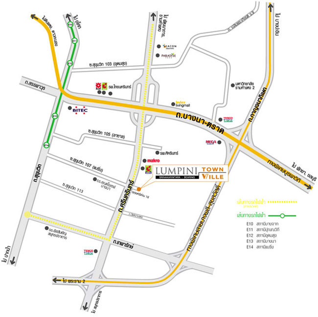 แผนที่โครงการ ลุมพินี ทาวน์ วิลล์ ศรีนครินทร์ - แบริ่ง โครงการตั้งอยู่ที่ ซอยศรีด่าน18 ถนนศรีนครินทร์ ตำบลบางแก้ว อำเภอบางพลี จังหวัดสมุทรปราการ เชื่อมต่อกับถนนหลักหลายเส้น เช่น ถนนบางนา - ตราด, ถนนเทพารักษ์, ถนนกาญจนาภิเษก และถนนสุขุมวิท ใกล้สถานที่สำคัญ และศูนย์การค้าต่างๆ เช่น โรงพยาบาลศิครินทร์, โรงพยาบาลบางนา, โรงพยาบาลไทยนครินทร์, โรงเรียนเซนต์โยเซฟบางนา, โรงเรียนนานาชาติบางกอกพัฒนา, โรงเรียนอัสสัมชัญสมุทรปราการ, โรงเรียนลาซาล, ไบเทคบางนา, สนามกอล์ฟราชนาวี และรถไฟฟ้าสายสีเหลือง "สถานีศรีแบริ่ง" (สถานีในอนาคต) (ดูเส้นทางของแต่ละสถานีได้ตามวิดีโอข้างล่างนี้)