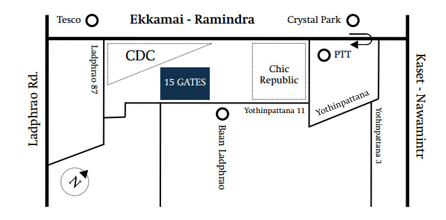 แผนที่โครงการ 15 Gates โครงการตั้งอยู่ที่ ซอยโยธินพัฒนา11 แขวงคลองจั่น เขตบางกะปิ กรุงเทพมหานคร เชื่อมต่อกับถนนหลักหลายเส้น เช่น ถนนลาดพร้าว, ถนนประดิษฐ์มนูธรรม, ถนนประเสริฐมนูกิจ และถนนนวมินทร์ ใกล้สถานที่สำคัญ และศูนย์การค้าต่างๆ เช่น โรงพยาบาลลาดพร้าว, โรงพยาบาลสินแพทย์, โรงพยาบาลเวชธานี, โรงเรียนเลิศหล้า, โรงเรียนนานาชาตินีวา, Crystal Design Center (CDC), The Crystal Park, Big C Extra, เทสโก้ โลตัส, โฮมโปร และ Chic Republic